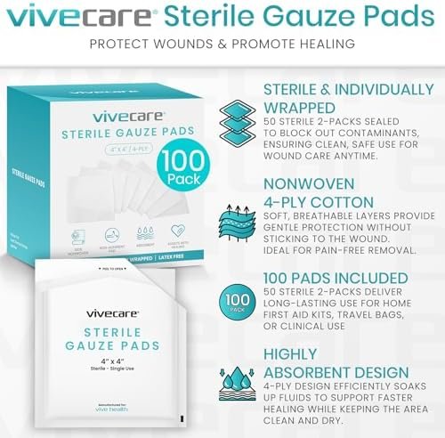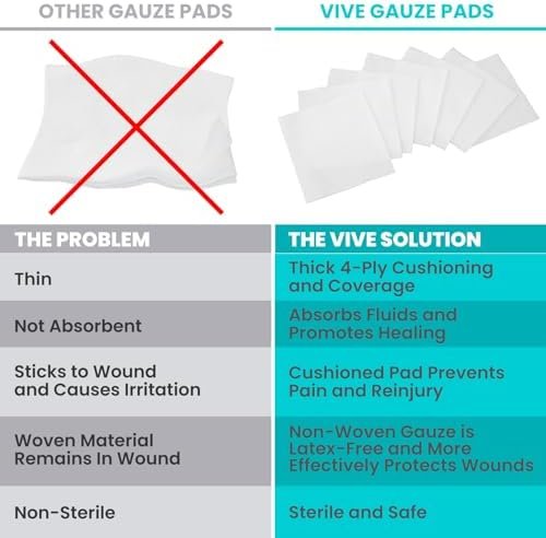 MULTIPURPOSE WOUND AND INJURY CARE: The Vive Sterile Gauze Pads are perfect for ulcers, wounds, scrapes, cuts, or other injuries that require clean, absorbent bandage strips that will ensure proper healing. Reduce the risk of infection with these sterile and soft gauze pads