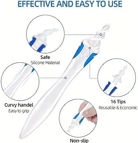 Efficient Cleaning: The soft silicone ear cleaning tool is designed to effectively remove earwax without causing any discomfort or pain. Multiple Replacement Heads: With 16 replacement heads, you can use this earwax removal tool for a long time without having to buy a new one. Easy to Use: The reusable earwax removal tool is easy to use and can be cleaned easily with water. Safe and Gentle: The soft spiral design of the earwax removal tool ensures that it is safe and gentle on your ears, making it suitable for all ages. Healthier Ears: By removing earwax regularly, you can prevent ear infections and promote healthier ears.