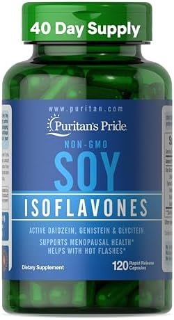 Puritan’s Pride Non-GMO Soy Isoflavones is designed to support menopausal health and alleviate symptoms associated with this natural transition.* Traditionally used in Asian countries for centuries, soy is a plant-based source of phytoestrogens that can help manage hot flashes and occasional sleeplessness.* Our formula is standardized to include important Isoflavones phytoestrogens—typically composed of Daidzin, Daidzein, Glycitin, Glycitein, Genistin and Genistein—ensuring you receive effective support for your menopausal journey.* Made with only non-GMO soybeans, this supplement is perfect for women in all stages of menopause—pre-menopause, peri-menopause, menopause, and post-menopause.* With 120 rapid release capsules per bottle, incorporating soy isoflavones into your daily routine is simple and convenient. *These statements have not been evaluated by the Food and Drug Administration. This product is not intended to diagnose, treat, cure or prevent any disease.