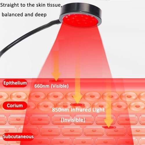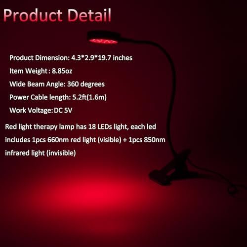 【Red Light Therapy Lamps Device】: Red light therapy lamp has 18 LEDs light, each light includes 1pcs 660nm red light (visible) + 1pcs 850nm infrared light (invisible) can gives you more comprehensive Skin Care. Red light device with 660 and near-infrared 850nm is the best combination wavelength for therapy by penetrate and cause thermal effects to increase tissue temperature, promote blood circulation, enhance metabolism, improve skin conditions improve cell vitality and relieve pain.